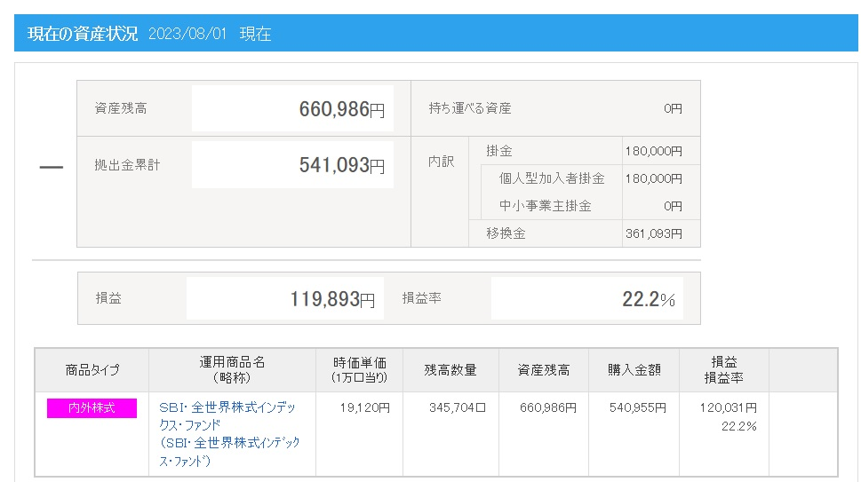 運用方法は、SBI証券で月8,000円からスタートし、2021年4月からは月10,000円を拠出、2022年10月からは月20,000円を拠出しています。拠出金をMAXの月23,000円に変更する手続き書類を6月頃に提出したけれど、まだ反映されていないなあ・・・。