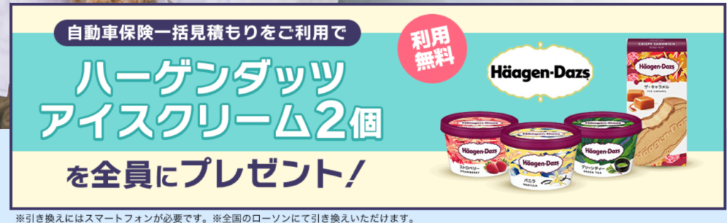 以下のリンクから自動車保険の一括見積をすると、ハーゲンダッツ1個orサーティーワンアイスクリームレギュラーシングル1個orコシヒカリ450gが貰えます。
